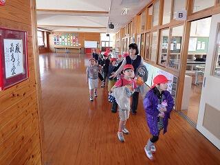 3月2日(金)は、お別れ遠足でした。はじめに、思い出を深めるためのふれあいの時間です。6年生の子ども達が工夫を凝らし企画・準備したボウリングや輪投げ等の様々なゲームを、1~5年生の子ども達がお客さんとして楽しみました。中でも、講堂のステージを暗くして行ったお化け屋敷は、大盛況でした。