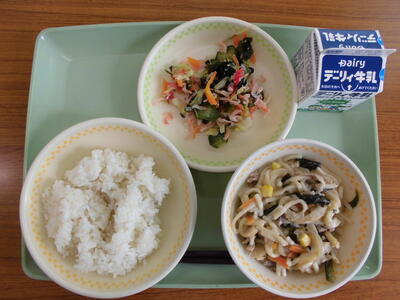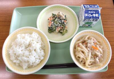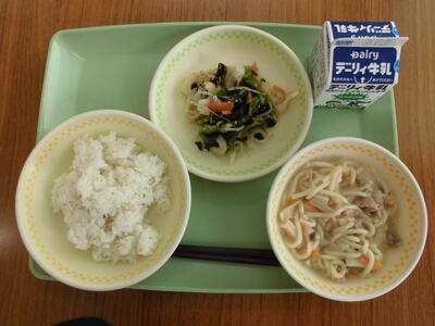 減量麦ごはん、牛乳、千切大根のうどん、洋風白和え