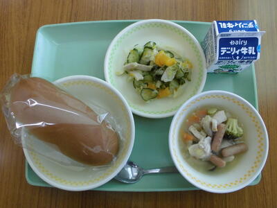 黒糖パン、牛乳、冬野菜のポトフ、みかんサラダ