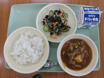 麦ごはん、牛乳、米粉のキーマカレー、海藻サラダ