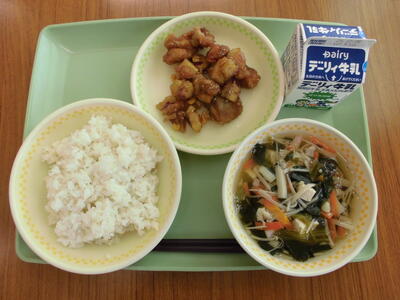麦ごはん、牛乳、春雨スープ、鶏肉の中華炒め