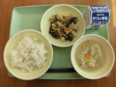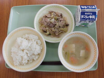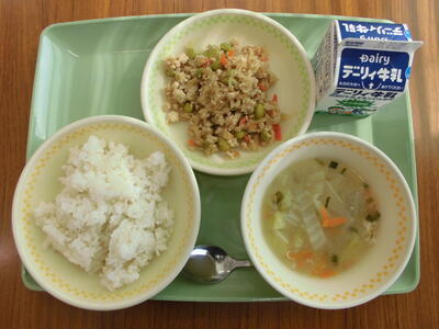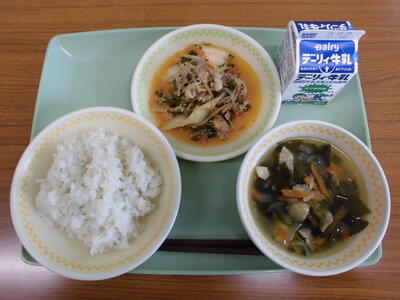 麦ごはん、牛乳、白菜のみそ汁、千切大根のそぼろ炒め