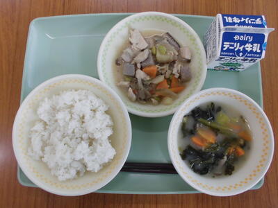 麦ごはん、牛乳、春野菜の吉野煮、千切大根の酢の物
