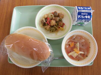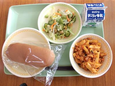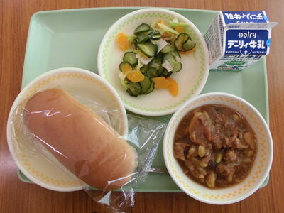 コッペパン、牛乳、かぼちゃのミートソース煮、日向夏ドレッシングサラダ