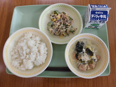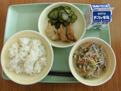 麦ごはん、牛乳、坦々春雨スープ、揚げぎょうざ、きゅうりの中華和え