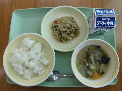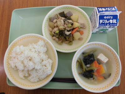 麦ごはん、牛乳、うったち汁、炒り豆腐