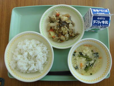 麦ごはん、牛乳、千切大根のみそ汁、鶏肉ときのこの旨辛炒め