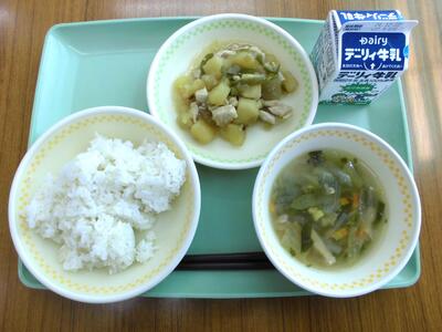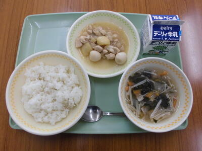 麦ごはん、牛乳、京芋のけんちん汁、鶏肉のみそころばかし