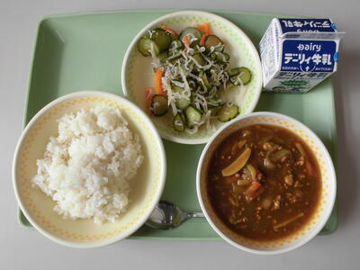 麦ごはん、牛乳、米粉のキーマカレー、きゅうりのじゃこ和え