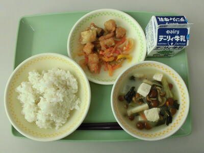 麦ごはん、牛乳、中華丼、大豆と小魚の揚げ煮