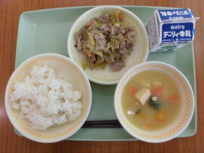 麦ごはん、牛乳、さつま汁、豚肉の生姜焼き