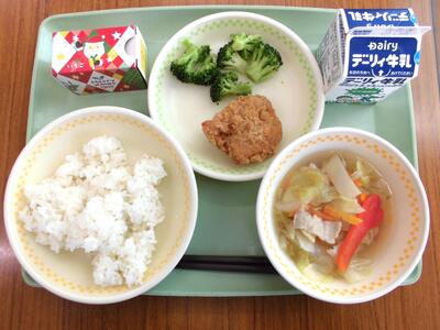減量麦ごはん、牛乳、カラフル野菜スープ、和風フライドチキン、添えブロッコリー、クリスマスケーキ