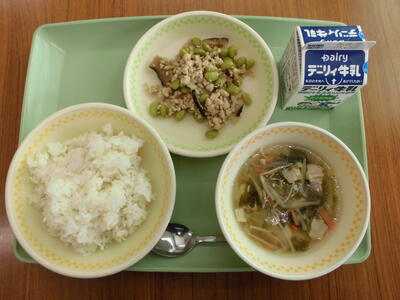 麦ごはん、牛乳、じゃがいものみそ汁、厚揚げのそぼろ煮