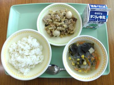 麦ごはん、牛乳、かき玉汁、がめ煮