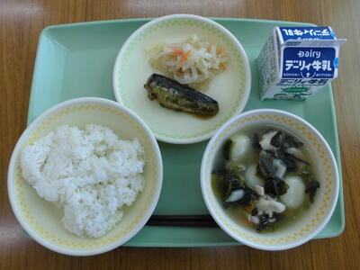 麦ごはん、牛乳、かぶのみそ汁、五目煮