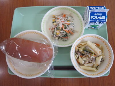 ミニ黒糖パン、牛乳、きのこのペンネ、ごぼうのかみかみサラダ