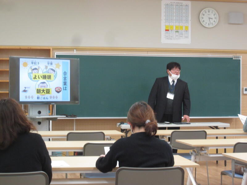 今回は、「睡眠と早ね・早おき・朝大豆」をテーマに、校長先生が講話をされました。