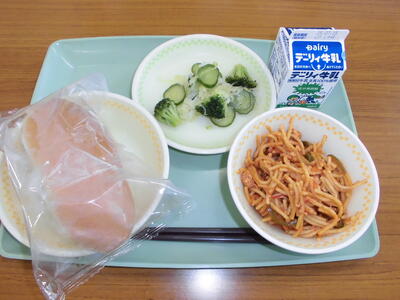 ミニコッペパン、牛乳、夏野菜のミートスパゲティ、ブロッコリーサラダ