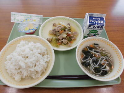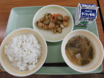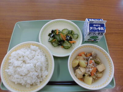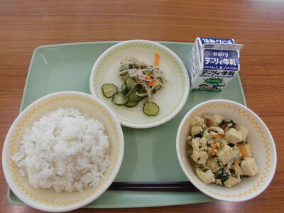 麦ごはん、牛乳、厚揚げのそぼろ煮、きゅうりとわかめの酢の物