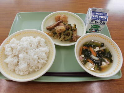 麦ごはん、牛乳、豆腐のすまし汁、鶏肉とゴーヤの揚げ煮