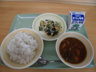 麦ごはん、牛乳、米粉の夏野菜カレー、海藻サラダ
