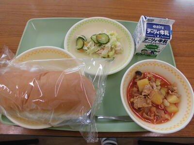 コッペパン、牛乳、ポークビーンズ、グリーンサラダ