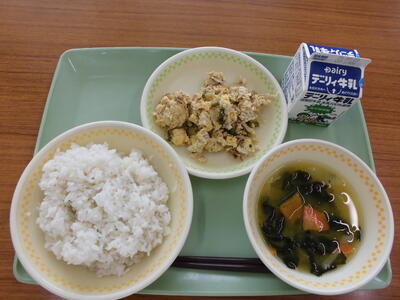 麦ごはん、牛乳、高野豆腐の卵とじ、きゅうりの土佐酢和え