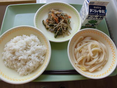 減量麦ごはん、牛乳、キムチうどん、きんぴらごぼう