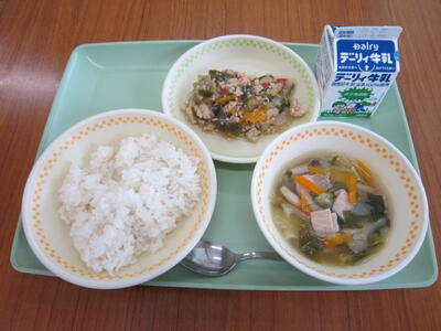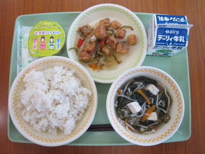 麦ごはん、牛乳、厚揚げのそぼろ煮、茎わかめのじゃこ和え