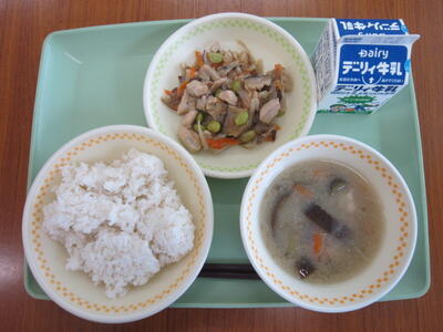 麦ごはん、牛乳、なすのみそ汁、鶏ごぼう炒め