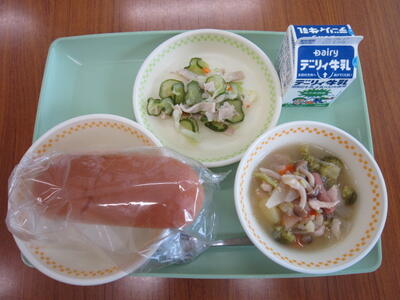 黒糖パン、牛乳、ポトフ、フレンチサラダ