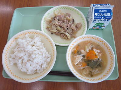 麦ごはん、牛乳、春雨スープ、キャベツのそぼろ炒め