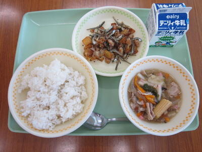 麦ごはん、牛乳、中華丼、大豆と小魚の揚げ煮