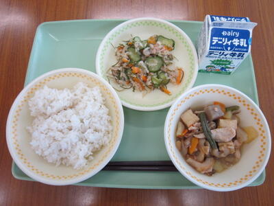麦ごはん、牛乳、筑前煮、千切大根の酢の物
