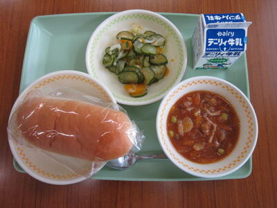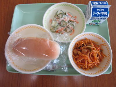 ミニコッペパン、牛乳、ひむかナポリタン、ツナ豆サラダ