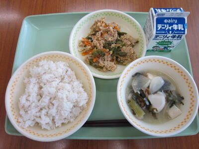 麦ごはん、牛乳、小松菜のみそ汁、ピーマンチャンプルー