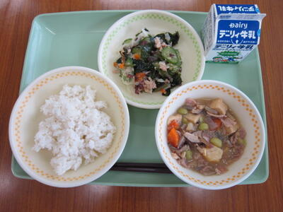 麦ごはん、牛乳、ごまみそ煮、海藻サラダ