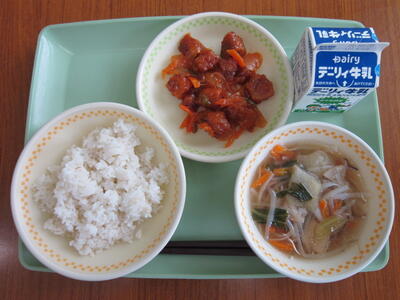 麦ごはん、牛乳、野菜とフォーのスープ、酢豚