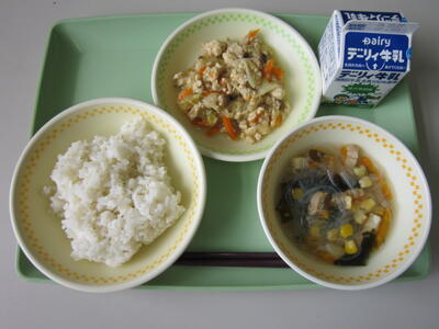 麦ごはん、牛乳、春雨スープ、キャベツのそぼろ炒め