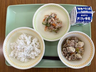 麦ごはん、牛乳、肉豆腐、梅おかか和え