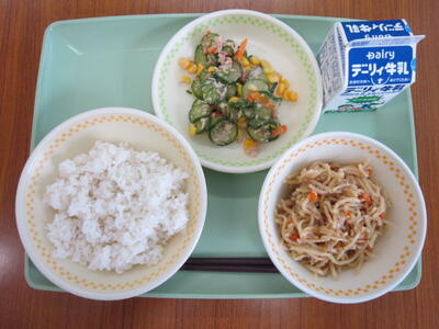 減量麦ごはん、牛乳、ジャージャー麺、コーンサラダ