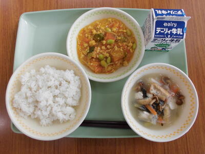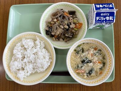 麦ごはん、牛乳、なめこのみそ汁、かぼちゃのそぼろ煮