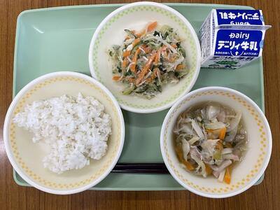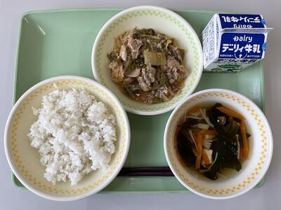 麦ごはん、牛乳、すまし汁、豚キムチ丼