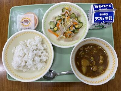 減量麦ごはん、牛乳、米粉のチキンカレー、コーンサラダ、焼きプリンタルト