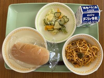 ミニミルクパン、牛乳、ミートビーンズスパゲティ、パインサラダ