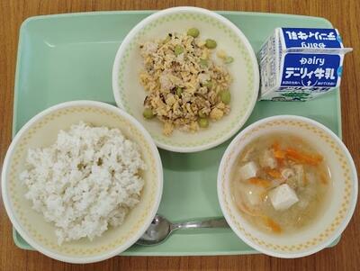 麦ごはん、牛乳、豆腐のみそ汁、三色そぼろ丼