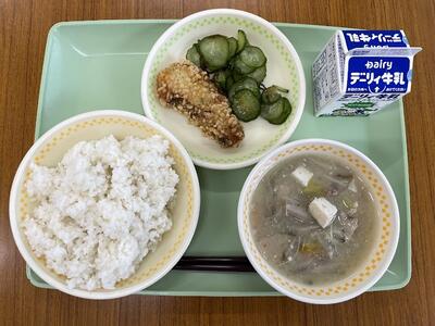 麦ごはん、牛乳、豚汁、ホキあおさフライ、きゅうりの塩こんぶ和え