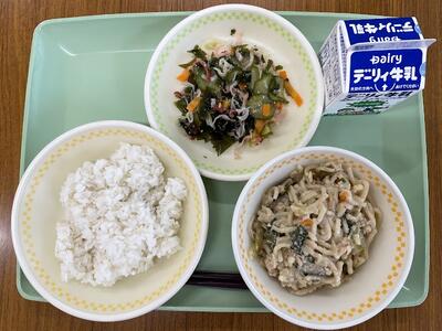 麦ごはん、牛乳、太平燕、バンバンジーサラダ