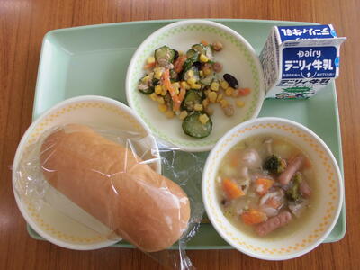 コッペパン、牛乳、ポトフ、ツナビーンズサラダ