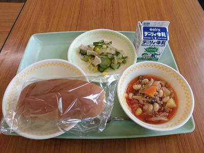 コッペパン、牛乳、豆乳のクリームシチュー、ズッキーニのサラダ